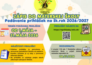 Podávanie prihlášky na vzdelávanie v materskej škole sa uskutoční od 1. mája do 31. mája 2026 elektronickou formou prostredníctvom portálu Elektronické prihlášky do škôl: https://eprihlasky.iedu.sk/